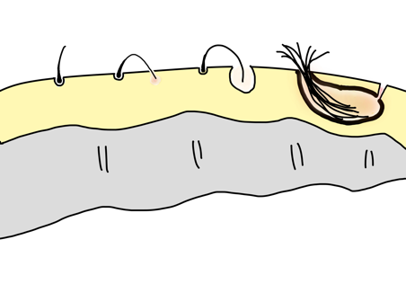 Il correspond à l’invagination de poils ou de débris pileux dans le derme. Avec les frottements, il s’inflamme et peut évoluer vers l’abcédation.